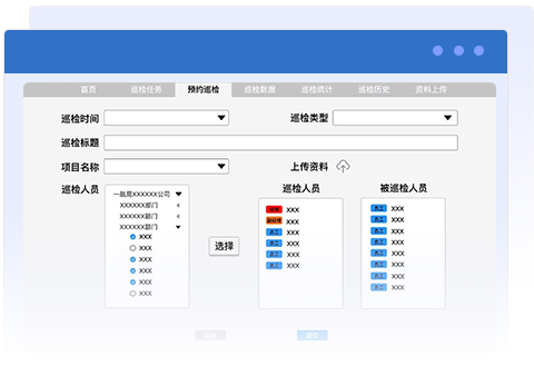 預(yù)約巡檢界面主要用來(lái)預(yù)約巡檢會(huì)議,在該頁(yè)面填寫(xiě)巡檢時(shí)間、巡檢類(lèi)型、巡檢標(biāo)題、項(xiàng)目名稱以及選擇巡檢人員和被巡檢人員,并上傳本次巡檢的流程資料。
