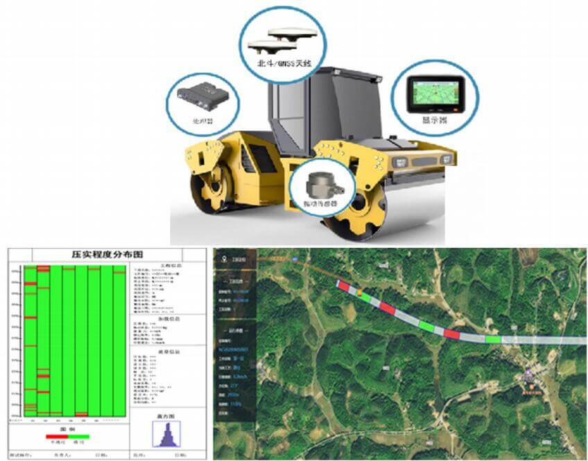 智能碾壓系統(tǒng)是利用北斗+GPS高精度差分定位技術(shù)、物聯(lián)網(wǎng)技術(shù)、實(shí)時(shí)通訊技術(shù)、大數(shù)據(jù)處理技術(shù)等,對(duì)壓路機(jī)的碾壓遍數(shù)、碾壓軌跡、碾壓速度、振頻振幅等數(shù)據(jù)實(shí)時(shí)采集,根據(jù)采集的數(shù)據(jù)結(jié)合試驗(yàn)檢測(cè)對(duì)施工質(zhì)量(壓實(shí)度)進(jìn)行分析判斷,及時(shí)掌握碾壓過(guò)程施工質(zhì)量狀態(tài)的技術(shù)。