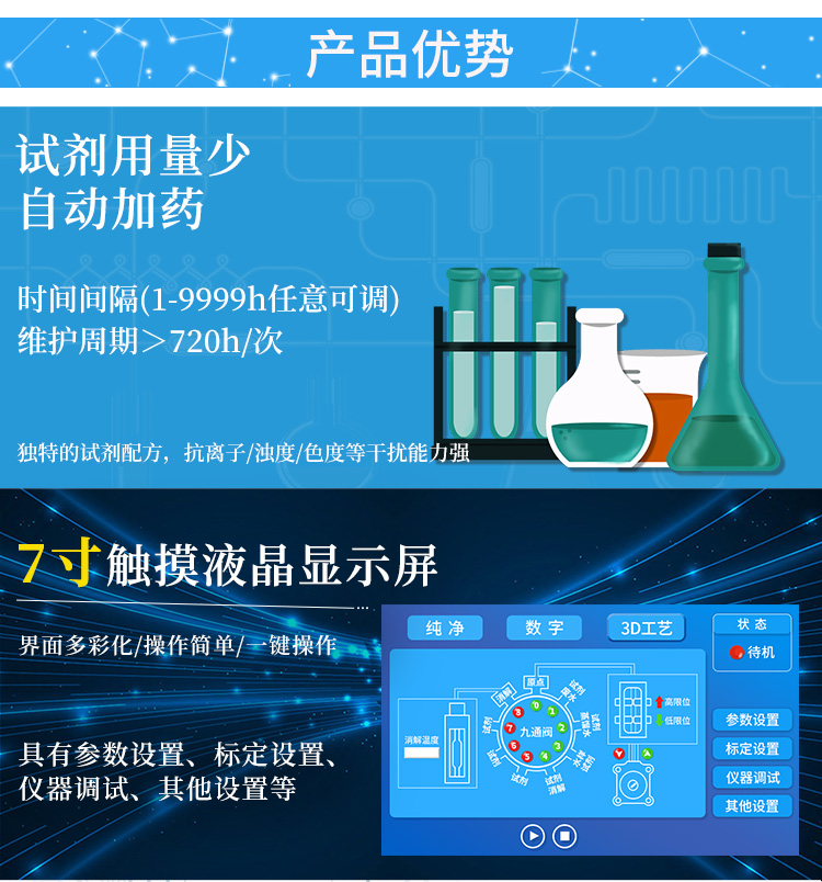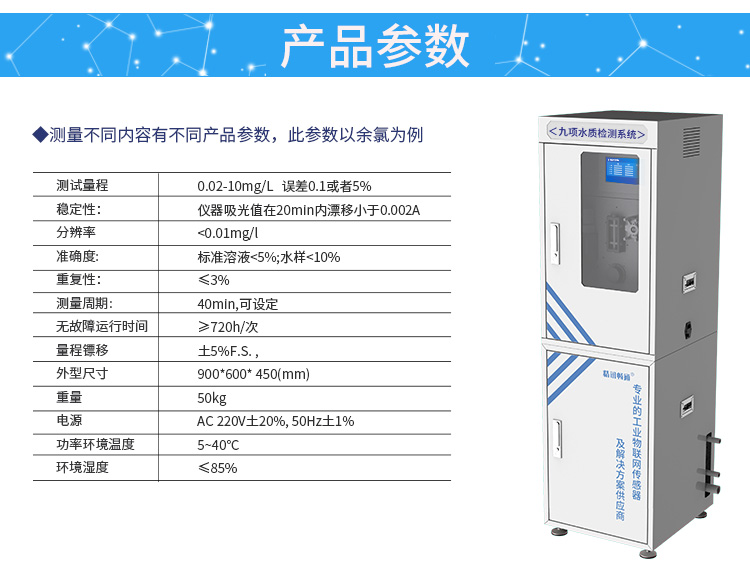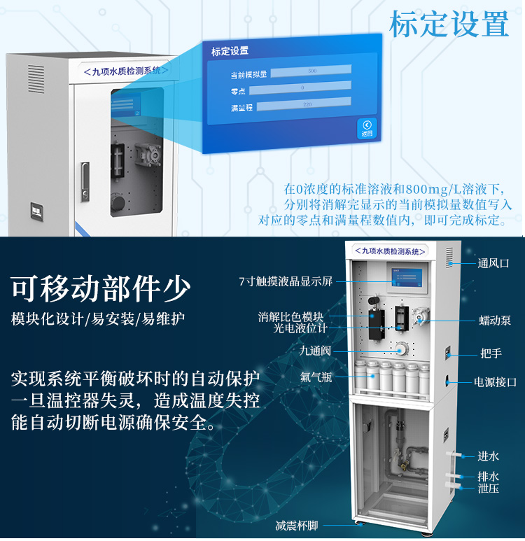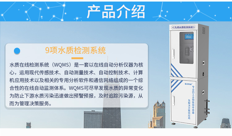 9項水質(zhì)檢測系統(tǒng)可以實現(xiàn)濁度,余氯,總氯,化合氯,二氧化氯,色度,嗅和味、細菌、PH,COD錳等參數(shù)的在線監(jiān)測,9項水質(zhì)檢測系統(tǒng)使得測量分辨率大大提高,實現(xiàn)了測定過程的自動化,可廣泛地應(yīng)用于廠礦企業(yè)排污口監(jiān)測、城市污水處理工廠進出口監(jiān)測、江河湖泊水質(zhì)監(jiān)測和污水治理。