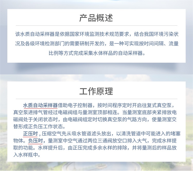 水質自動采樣器借助電子控制器,按時間程序定時開啟往復式真空泵,真空泵進排氣管經過電磁閥組與量測室頂部相連。當量測室底部夾緊排放電磁閥處于關閉狀態時,由電磁閥組定時切換真空泵的氣路方向,使量測室交替形成正負壓工作狀態。