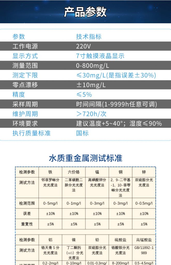 檢測范圍:鐵、六價鉻、錳、銅、鋅、鉛、鎳、鋁等重金屬離子